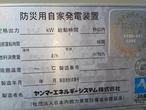 発電機【2203001】ヤンマー防災用自家発電設備39KVA 2005年式買取