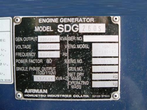 発電機【2008051】北越工業㈱製ディーゼルエンジン中古発電機SDG260S型2003年製買取