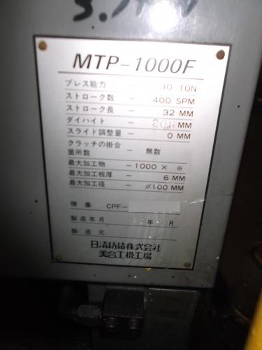 鍛圧機械買取【2301630】日清紡績製 MTP-1000F 年式:昭和63年製 鍛圧機械買取
